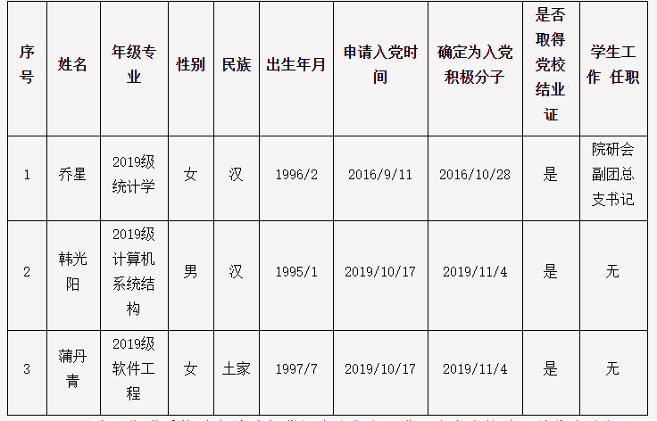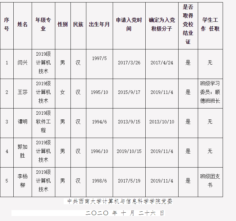 经2019级研究生二党支部培养考察,在听取党小组、培养联系人、党员和群众意见的基础上,经党支部(或支委会)讨论,确定闫兴等5位同志为发展对象。现根据公司发展对象备案制度进行公示,公示期为2020年10月26日-30日...