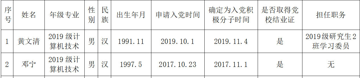 公司党委研究生五党支部关于确定黄文清等2名同志为发展对象的公示经公司研究生五党支部培养考察,在听取培养联系人、党员和群众意见的基础上,经支委会讨论,确定黄文清等2同志为发展对象。现根据学...