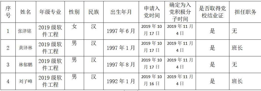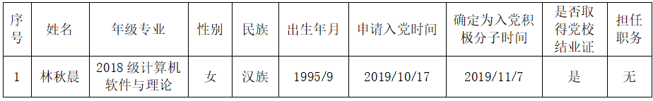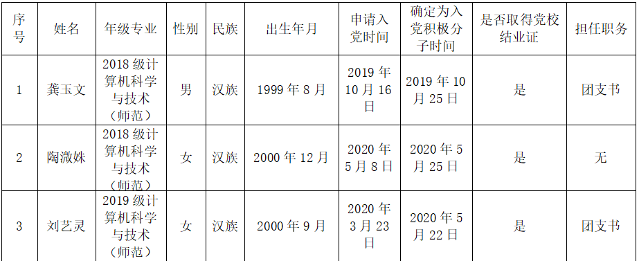 经公司计算机科学与技术(师范)一党支部培养考察,在听取党小组、培养联系人、党员和群众意见的基础上,经党支部(或支委会)讨论,确定龚玉文等3同志为发展对象。现根据公司发展对象备案制度进行公示,公示期为202...