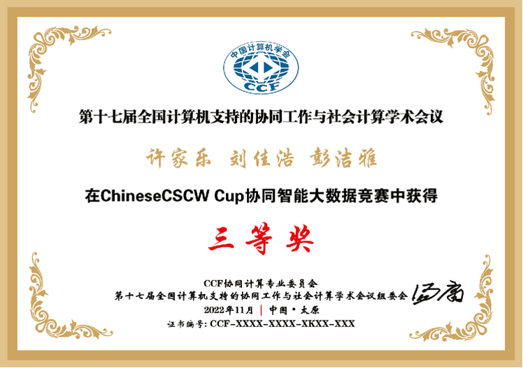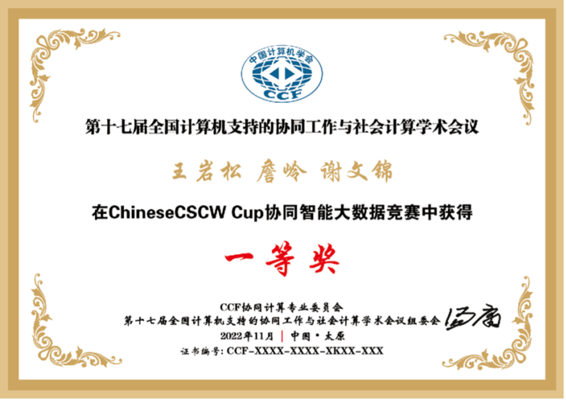 近日,由中国计算机学会(CCF)协同计算专委会组织的ChineseCSCW2022协同智能大数据竞赛在山西太原成功举办,公司“复杂系统与交叉科学应用”团队研究生组建的三支参赛队伍分别获得一等奖、三等奖和优胜奖。“复杂系统与交叉科学应用”团队已连续2年包揽此项比赛的一等奖(去年报道见http:/info/1040/1800.htm),展现了团队在社会计算领域的研究实力。