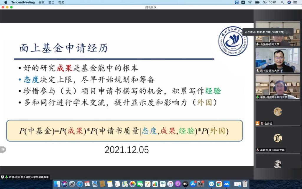俞俊教授强调研究成果是提高基金命中率的根本,科研人员的研究态度决定上限,要不断积累经验,加强学术交流,提升显示度和影响力,并具体从项目选题、申请书撰写和打磨等方面,分享了基金申请的经验。此外,聚焦重点(联合)基金和人才类项目,俞教授强调指南建议对重点基金申报的重要性,指南内容要面向前沿研究热点或产业难点问题,涉及范围适中且突出自身优势特色,多家单位相互支撑;人才类项目要突出重点科研业绩,重视研究成果的学术影响及应用情况。