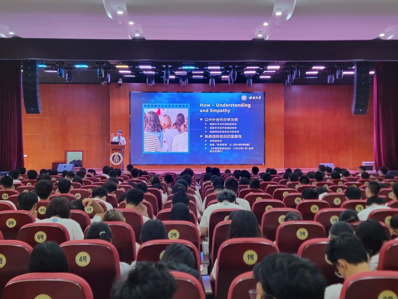 9月13日上午,张自力教授在员工处107报告厅为中外合作办学新生开展专题讲座“跨文化合作与中外合作办学”。张自力老师分享了公司近年来在中外合作办学领域取得的丰硕成果,生动展示了联合培养平台为员工搭建起通往世界的桥梁,让学术资源跨越国界,实现共享与融合的有效作用。张老师结合个人在国际合作办学领域的丰富经验和深刻洞察,鼓励员工们要敢于走出舒适区,积极拥抱多元文化,通过参与国际项目、交流访问等方式,拓宽视野,增长见识。他希望同学们充分利用国际化教育高地的独特资源与优势,勇于探索未知领域,敢于挑战自我,在跨文化交流中碰撞思想火花,汲取智慧养分。