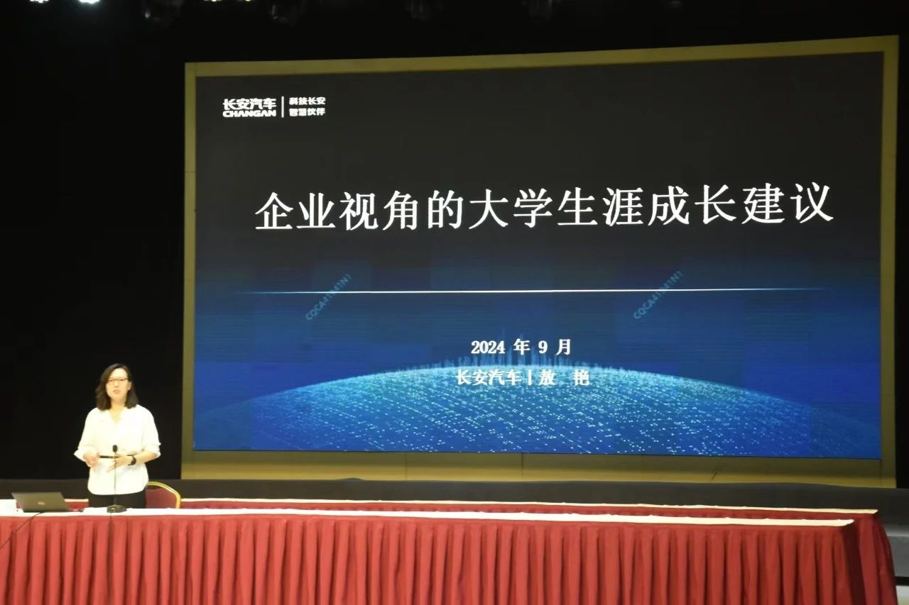9月11日上午,长安汽车人力资源全球招聘总监敖艳女士在光大礼堂为全体新生开展“企业视角的老员工涯成长建议”专题讲座。敖艳女士从智能网联时代的到来谈起,表示汽车作为工业文明的皇冠,是所有技术和学科的集大成者,正在被新时代、新技术所重新定义。作为大型移动智能与计算终端、新型储能单元、移动多功能空间和数据采集载体,汽车产业对新时代的人才也提出了新的要求。她希望同学建立广阔、开放的思维格局,既抱有天马行空的想象与梦想,也带着乐观、坚毅的品质全方位多角度看待世界,从深度、高度、宽度、角度提升思维,淬炼职场的成熟度,注重沟通与表达、文学与写作、礼仪素养、人际感召力等方面,培养多学科交叉能力,为将来的职业发展做好充分准备。