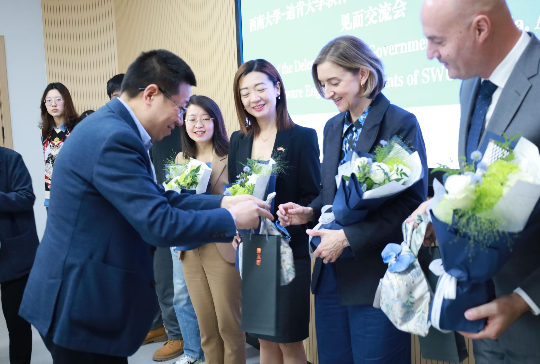 活动渐入尾声,同学们对维多利亚州政府代表团专业而细致的解答表达感谢,并为代表团成员送上小花束,陈武副经理代表公司赠送了西大文创纪念品。交流会圆满结束后,全体参会人员合影留念。此次维多利亚州贸易投资成都代表处的到访搭建起了良好的沟通桥梁,让员工们近距离了解澳大利亚教育体系、文化魅力与行业前沿动态,也为他们的未来学习和职业规划开拓了新思路。
