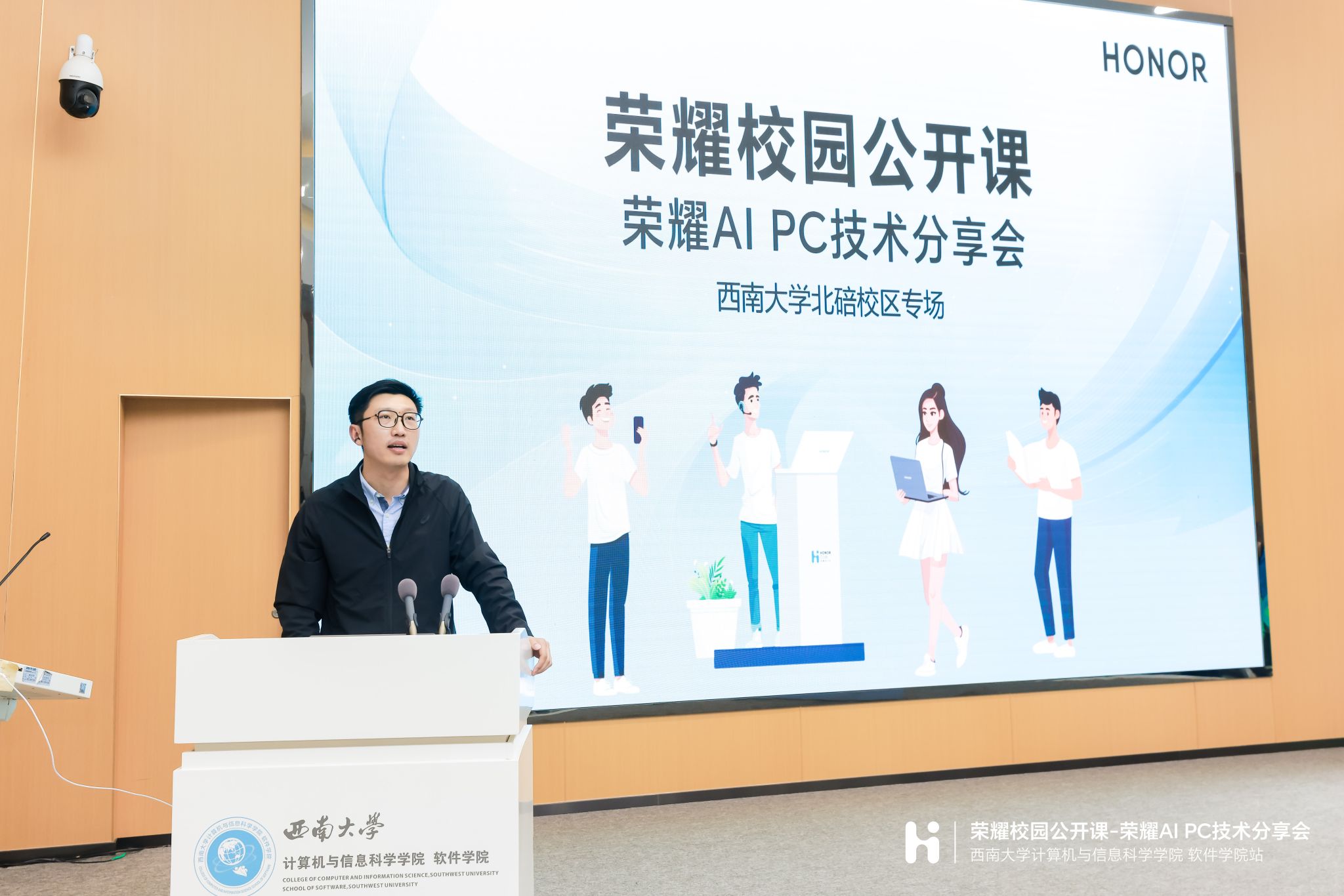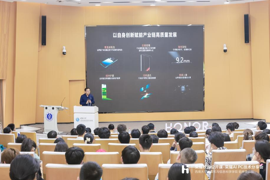 活动上,荣耀重庆业务部部长闫贝贝先生、荣耀PC YOYO助理架构师尚智先生为大家带来了精彩纷呈的演讲。闫贝贝先生首先向同学们介绍了荣耀品牌的发展历程和发展理念。他强调,荣耀的崛起不仅依赖于技术的创新,更根植于对品质的坚守和对服务的执着追求,鼓励同学们要勇于追求梦想、敢于创新、不断奋斗。