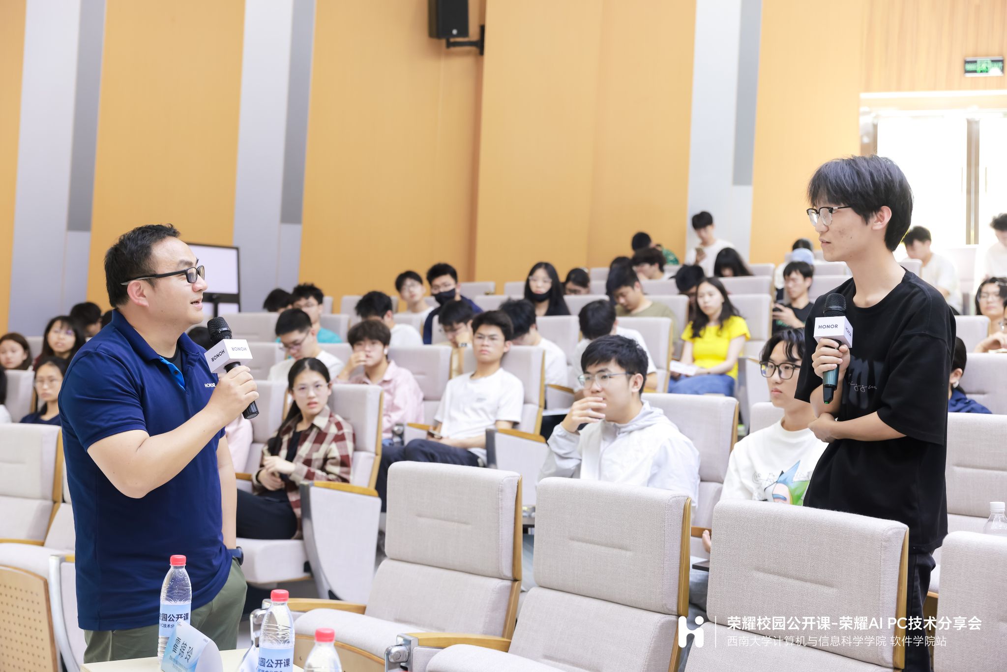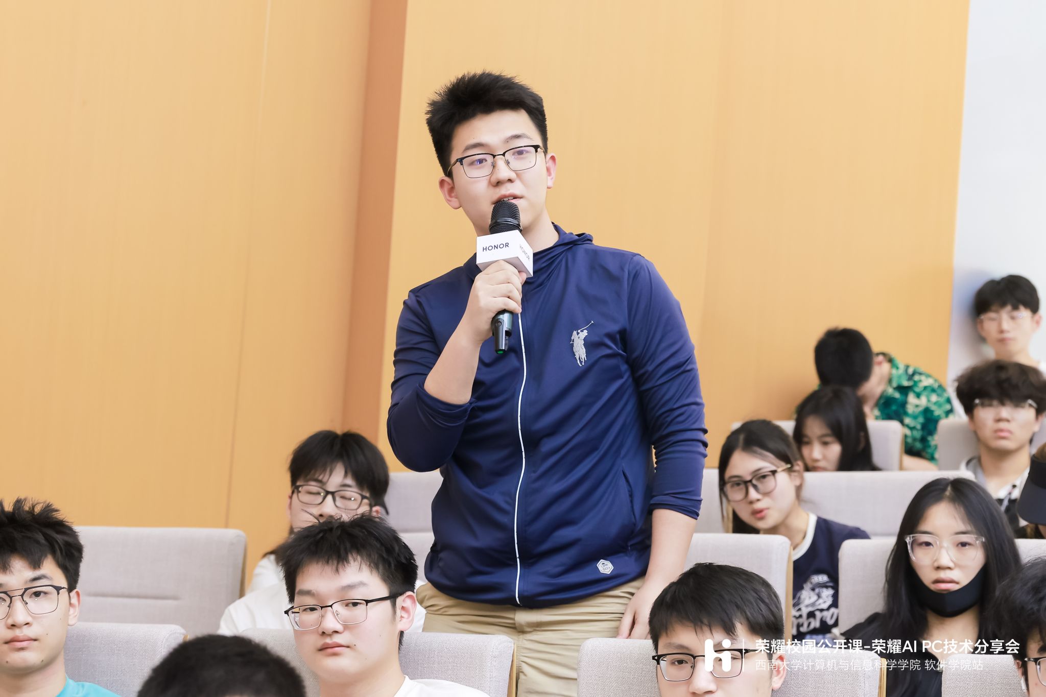 在两位老师的讲解后,活动进入互动环节,同学们热情高涨,就荣耀产品以及电子产品的设计理念、技术细节和未来趋势等积极提问,尚智先生从AI技术的实际应用、荣耀的发展前景以及AI技术可能带来的行业变革等方面进行了讲解回答。