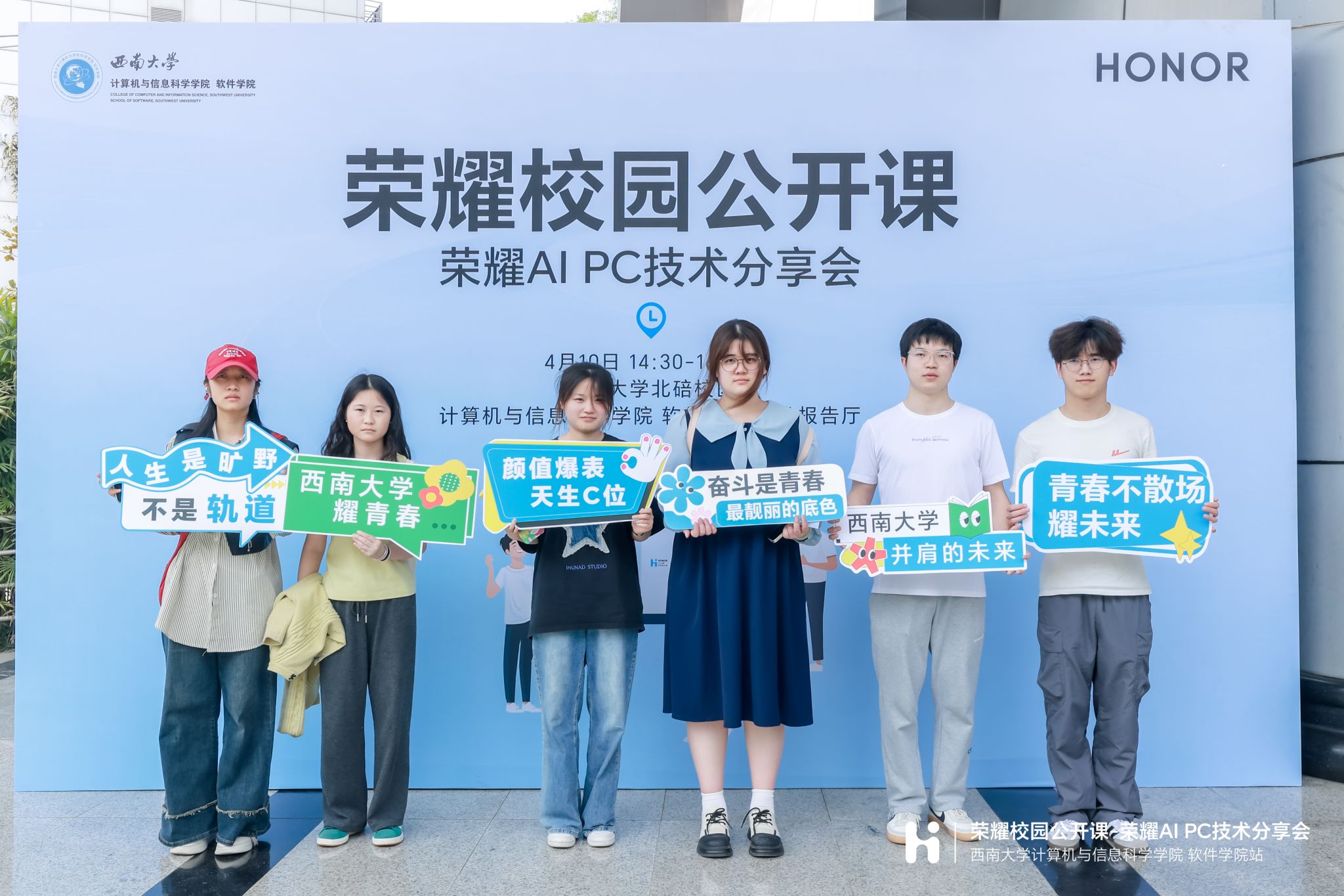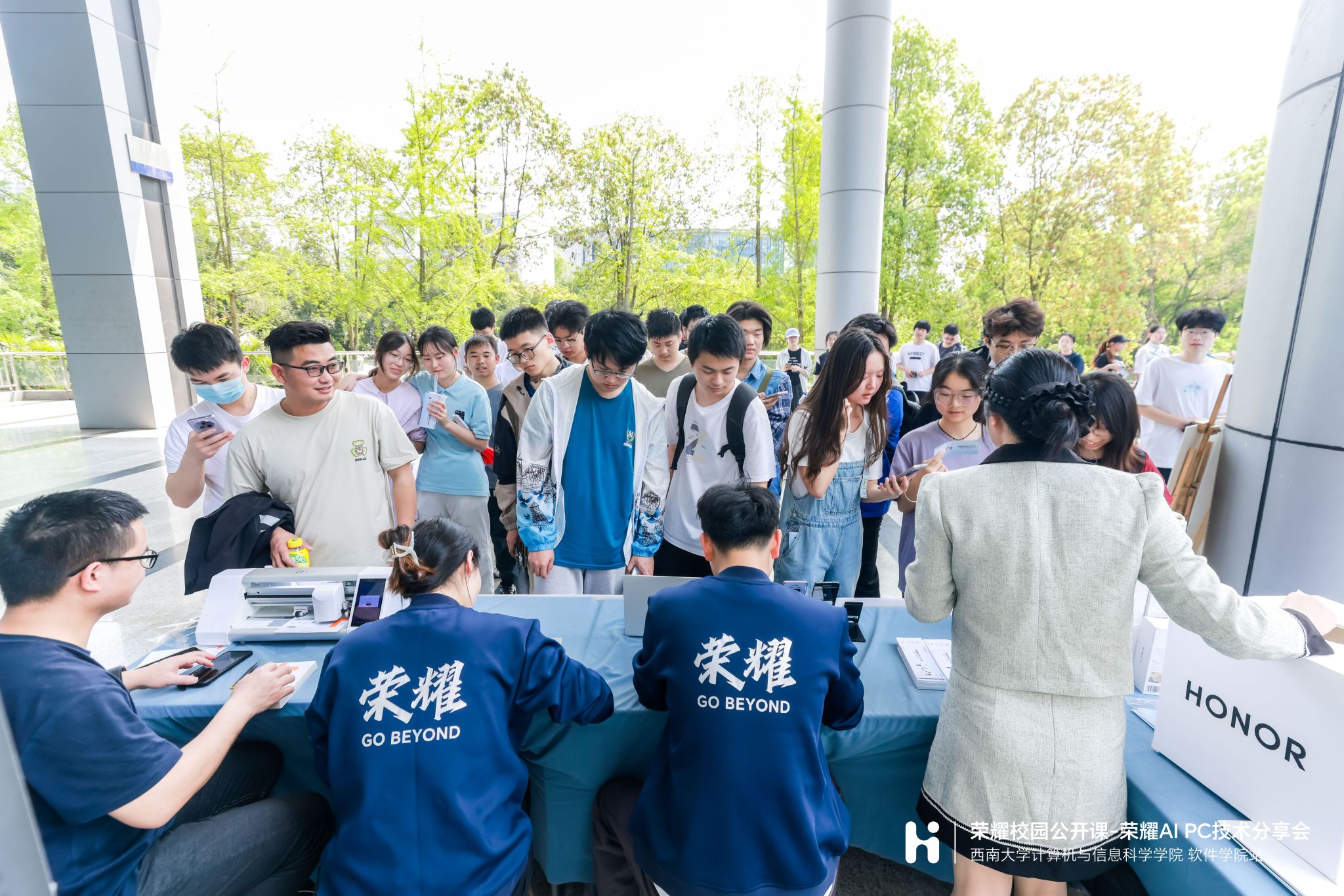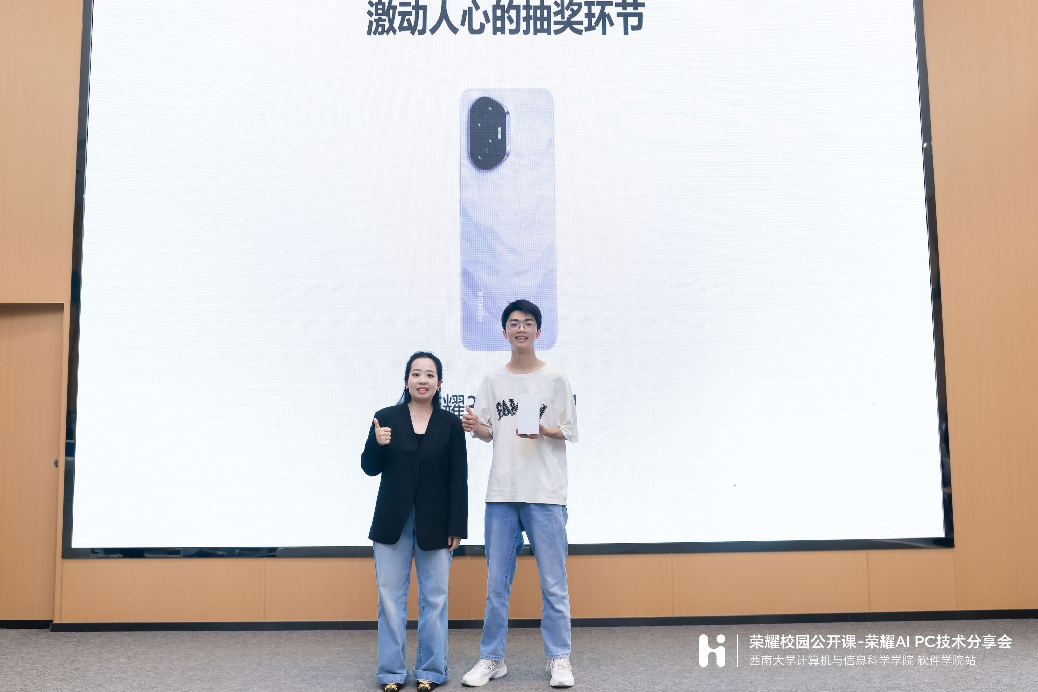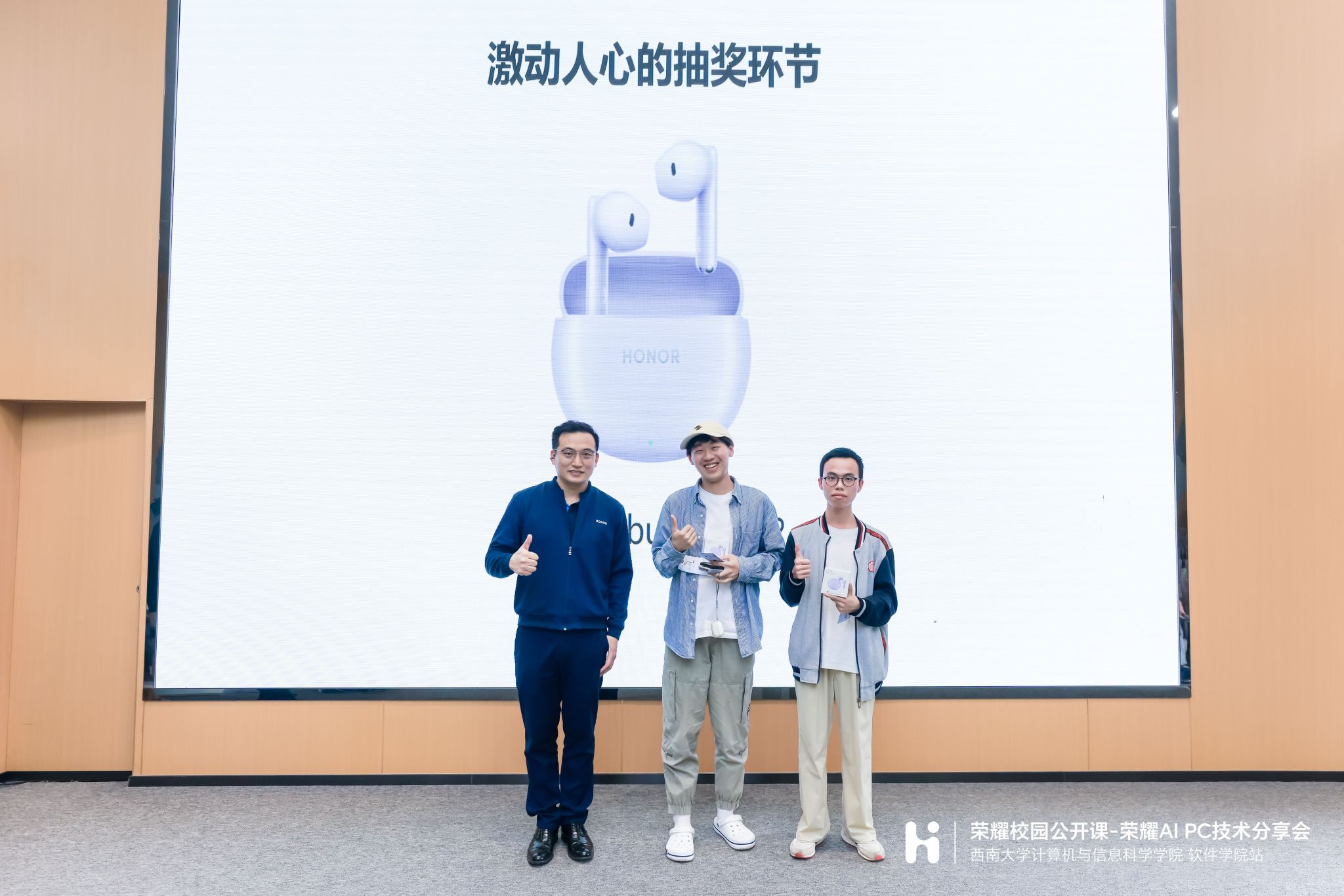 此次活动还设置了荣耀产品体验、免费贴膜、线上抽奖等环节,荣耀公司为在场的同学准备了荣耀300手机、荣耀手表5、荣耀耳机等丰厚的礼品活动,现场反应热烈,气氛活跃,同学们对荣耀 AI PC系统和荣耀生态有了更全面的了解。