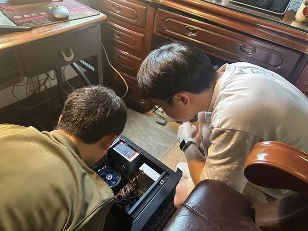 图4-5:团支部员工代表正帮助刘勤晋老师维修电脑