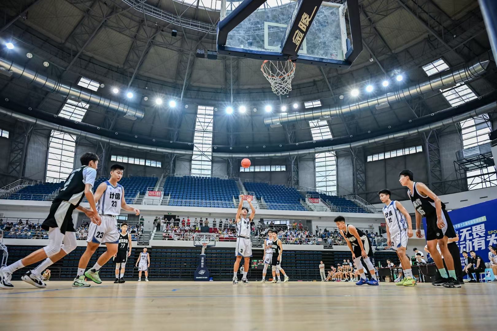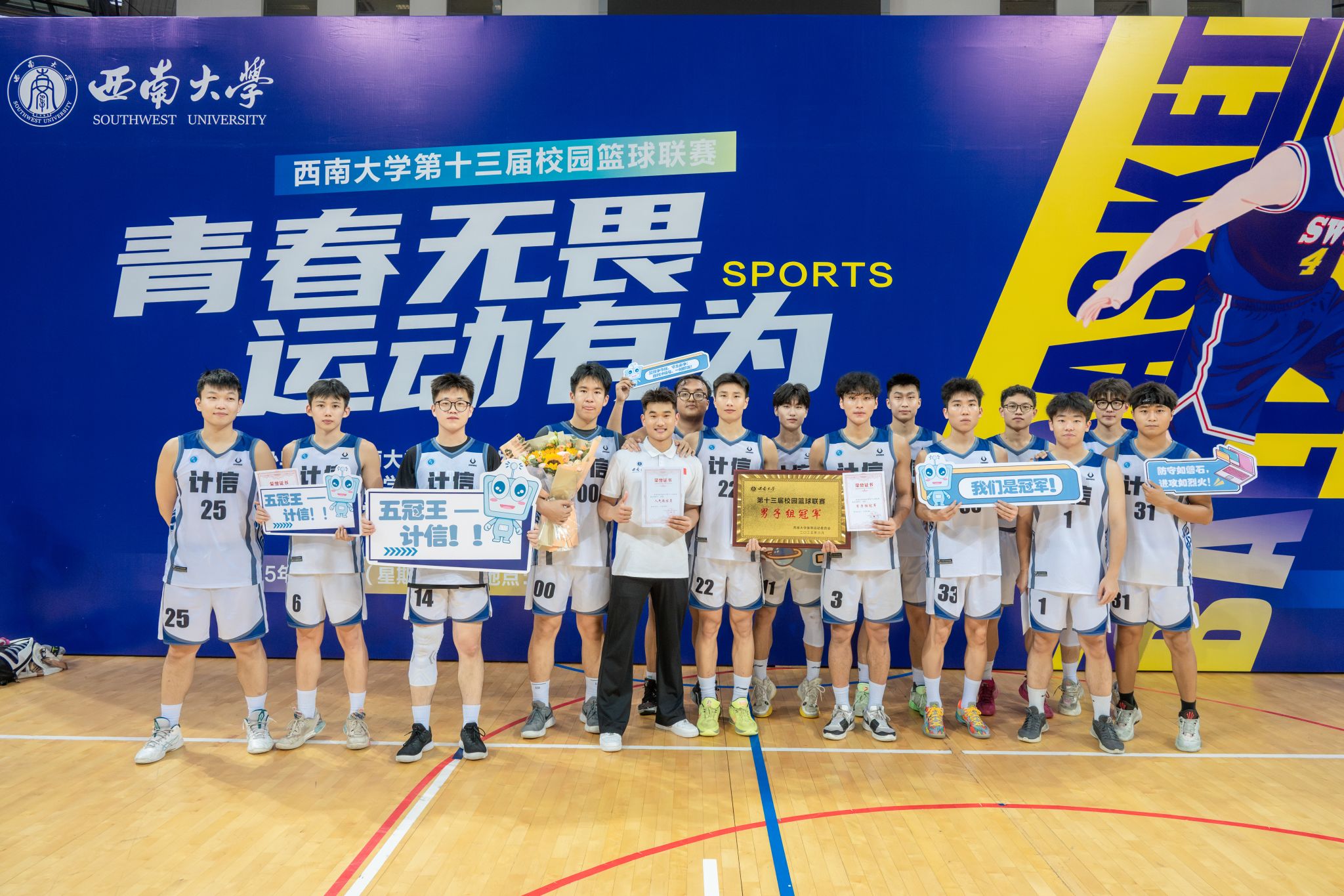 随着终场哨响,公司篮球队全体队员将冠军奖牌高高举起,现场爆发出山呼海啸般的欢呼。观众席上,由公司党委书记孙楚航、副书记王晖、副经理李娅、全体辅导员老师以及200余名同学们组成的“计信啦啦队”举起KT板,拼出“5TH CHAMPION”的图案。这一刻,篮球与计信交织,汗水与智慧共鸣,公司男子篮球队用五连冠的壮举证明:在伟德体育的赛场上,传奇永不谢幕,奋斗永无止境!