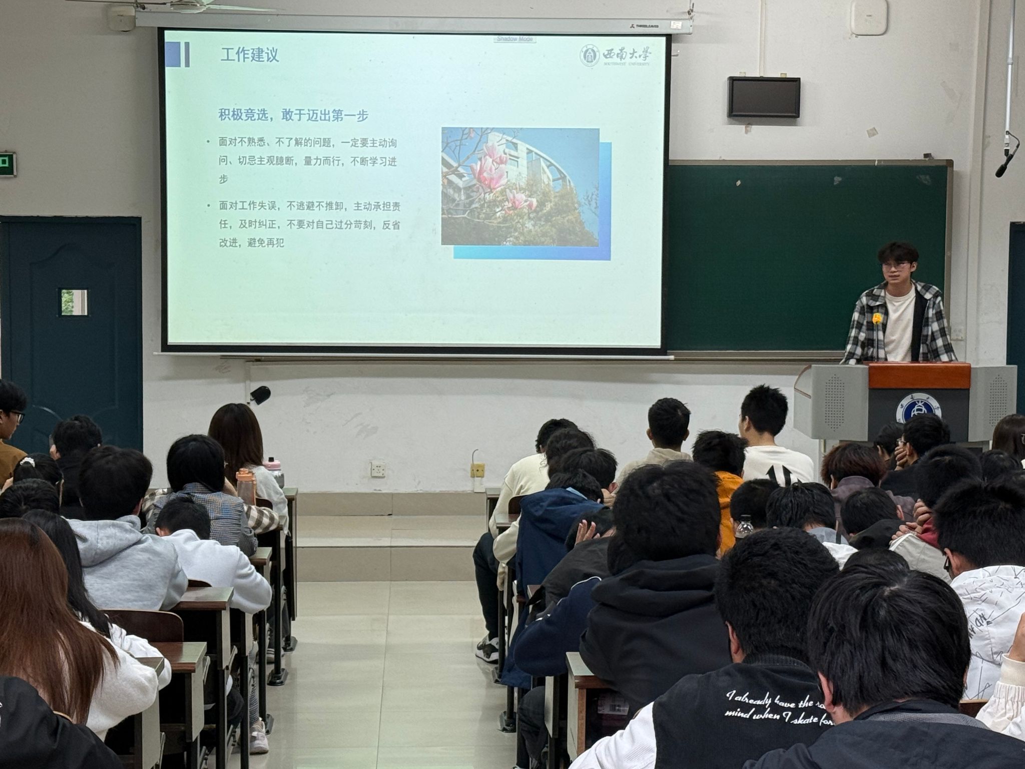 杨成鹏通过班长任职经历,分析大学和高中的差别,助力新生实现角色转变;雷心怡以“学业领航”为题,梳理学科学习和毕业发展前路,提供实用规划建议;邓凯瑜从心态、时间、生活三维度分享自我管理经验,给出处理宿舍关系、校园恋爱与培养兴趣的建议;崔岩峰以幽默风格分享辩论与摄影社团的收获,鼓励新生按自身节奏选择生活方式;廖欣然分享通过攀岩、篮球等运动释放压力的心得,还推荐校园周边美食,让分享更具生活温度;代双遥鼓励大家“别怕犯错”,强调反思与明确方向的重要性;邱艺芸则以“以奋斗之我,绘青春光彩”作结,用激昂演讲鼓励学弟学妹将奋斗精神贯彻老员工活始终。
