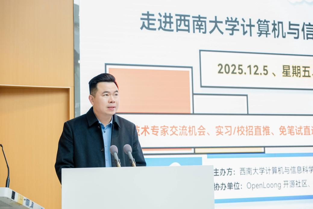 罗辛经理为活动开启致辞。他表示,“开源”与“AI”的深度融合,正成为加速创新、汇聚智慧的关键引擎。“源启高校”活动是一次难得的契机,可以让同学们近距离与行业精英交流,深入了解AI与开源技术的最新动态与实践经验。希望同学们能够珍惜机会,认真聆听,积极思考,踊跃互动,在交流中碰撞出思维的火花,在探讨中启迪未来的方向。