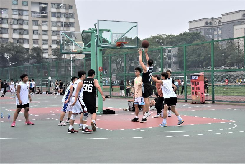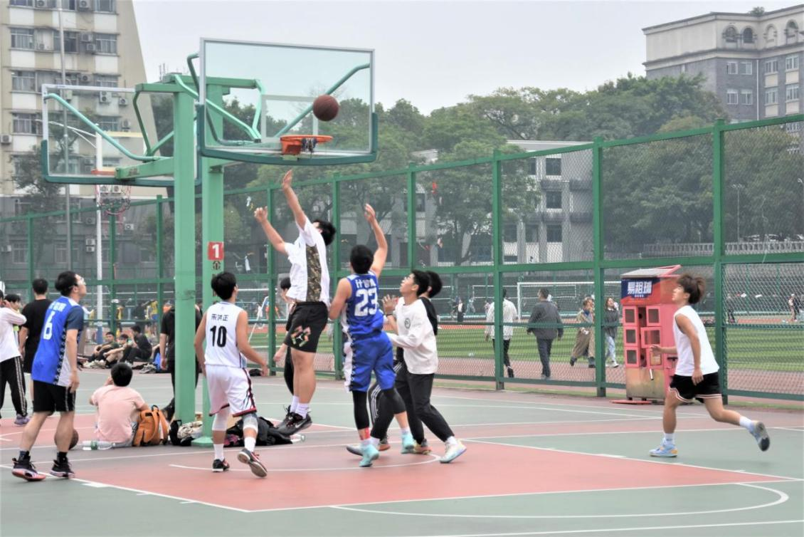 本次比赛双方分别是教师队和公司员工篮球队。随着裁判员一声号令,教师队率先发球,热血般棕红色的篮球高高飞向天空,教师队紧锣密鼓组织进攻,员工篮球队奋力奔跑,强悍防守。赛场上,球员们激战对抗的身影、带球冲锋的英姿、华丽投球的抛物线,让围观的师生不时爆发出阵阵掌声和喝彩声。