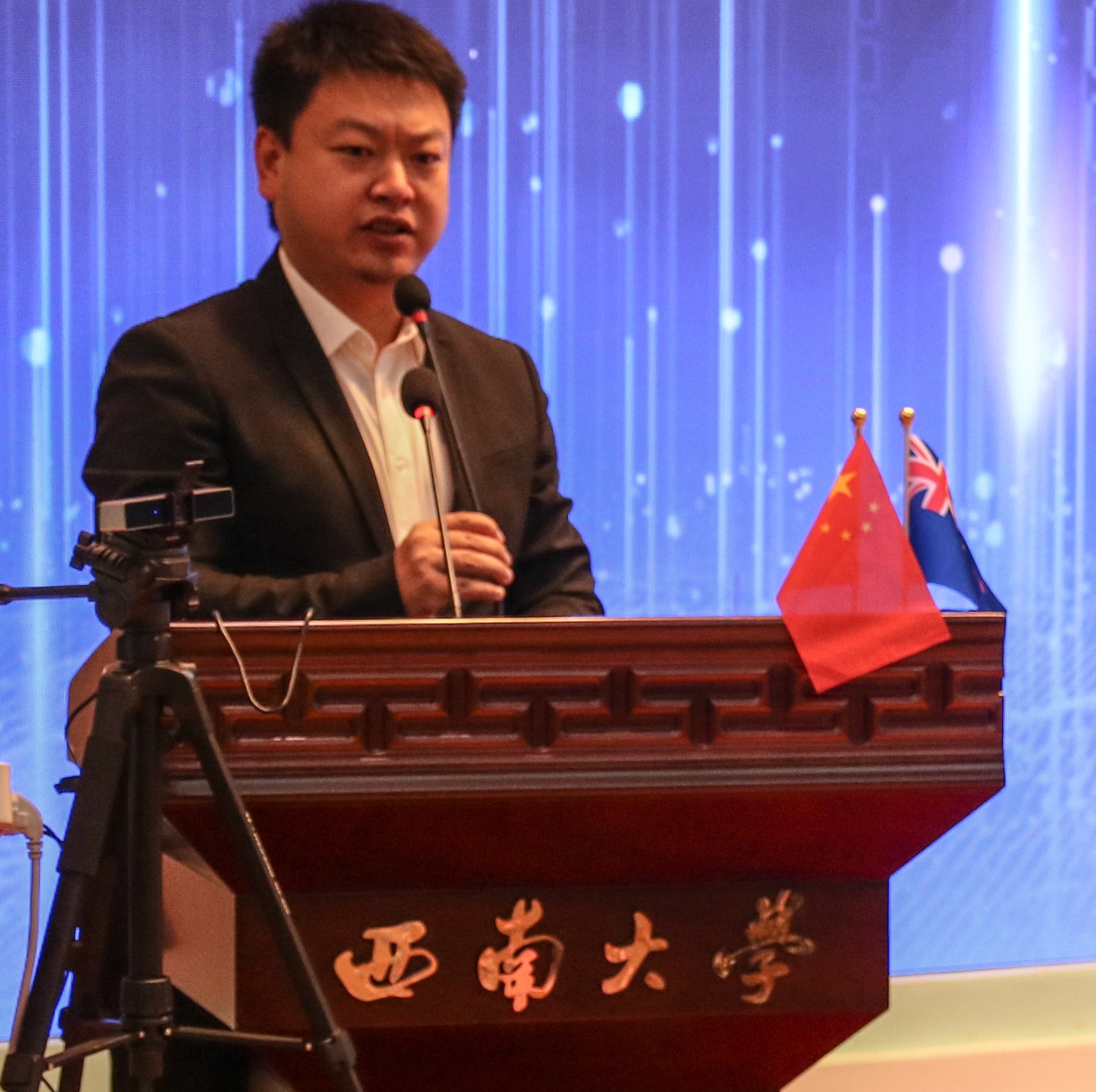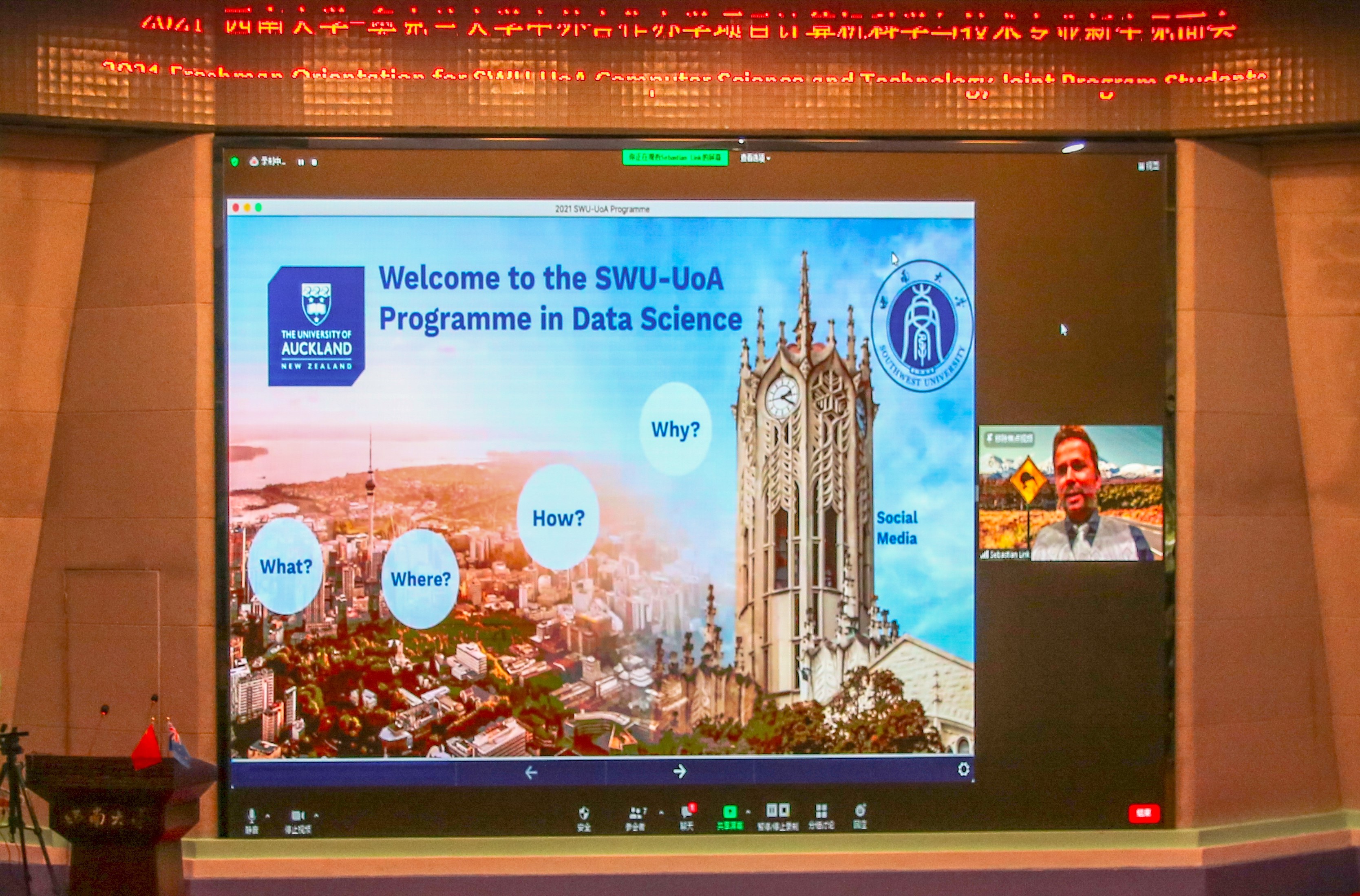 然后,播放了奥克兰大学董事长道恩·弗雷什沃特教授的祝福视频;随后,奥克兰大学理学部副部长塞巴斯蒂安·林克教授从Where、What 、How、Why四个角度为大家详细介绍奥克兰大学和Data Science这门学科,比较了奥克兰大学在全球的优势,给同学们解释了中外合作办学3+2项目在西大和奥克兰大学课程的详细设置,介绍了学科领域顶尖专家,最后祝愿大家都能顺利到奥克兰大学深造。