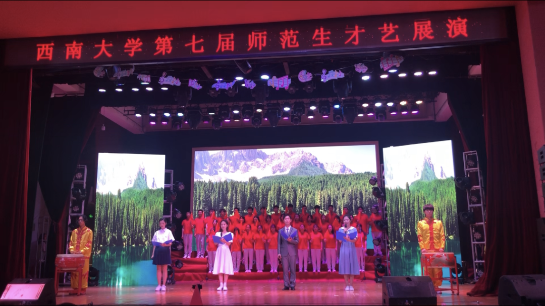 该节目由公司师范生自导自演,公司几十位师范生身穿红色礼服,深情朗诵、歌唱,表达了少年壮志将不畏逆流阻隔,直击高远苍穹的情怀。