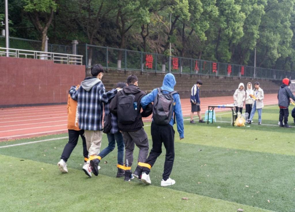 集体项目“五人六足”以小队为单位进行比赛,参赛团队经过简单的练习后分两队进行比拼,有效增强班级成员之间的协作能力。同学们肩并肩,喊着“一二,一二”的口号,一步一步向前,在比赛中传递着团结精神。