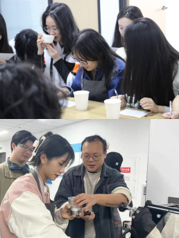 活动伊始,詹老师向同学们介绍到咖啡是一种植物,一种商品,更是作为一种饮品而受全世界喜爱。随后詹老师讲解到咖啡在不同生长环境下的独特风味,他精心准备了咖啡杯测小游戏,他拿出六种不同风味的咖啡豆,手动研磨,让同学们通过嗅觉、味觉的多重体验,去感受每一颗咖啡豆的独特风味及背后所蕴藏的故事。游戏过程中同学们热情高涨,细心品味,试图通过微妙的香气和口感差异,找寻与咖啡的契合之处。詹老师讲到,咖啡不仅是一种饮品,更是一种文化的象征、一种生活的艺术。从咖啡豆的研磨、冲泡,到咖啡的品鉴、享受,每一个环节都充满了无限的可能性和创意。