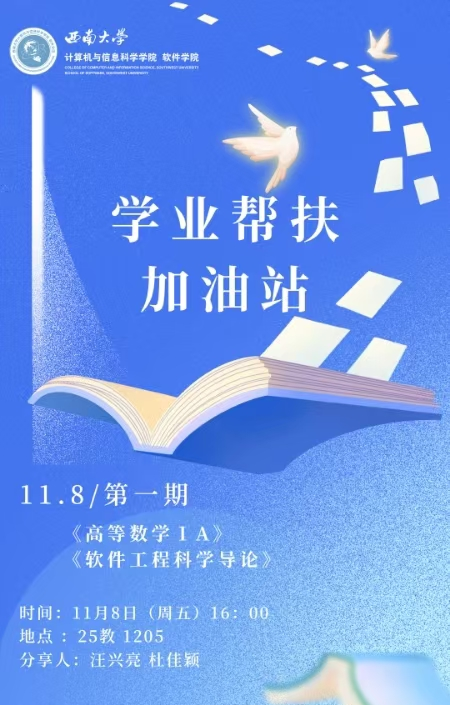 2024年11月8日,2024秋季学期第一期“学业帮扶加油站”在25教1205正式启动。本期活动针对《高等数学IA》和《软件工程科学导论》两门课程进行学习内容分享与重点知识讲解。助力公司学子夯实专业基础,疏解学习难题,增强学习动力,提升学业水平。