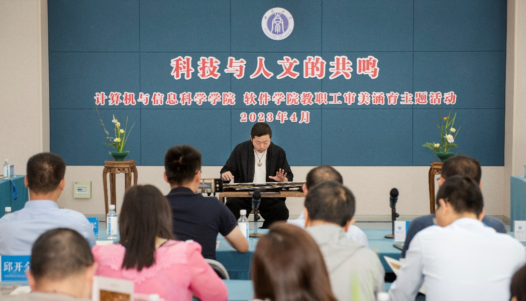 本次活动邀请了青年古琴家刘雳老师现场演奏了《流水》、《潇湘水云》、《二泉映月》等经典曲目。松沉而旷远、清亮而纯美,浑厚而悠长的古琴音符,吟猱余韵、细微悠长,时如人语。通过琴音唤起恬淡悠远的回忆,缓解教职工平时繁忙工作的紧张焦虑,帮助教职工修心怡情。
