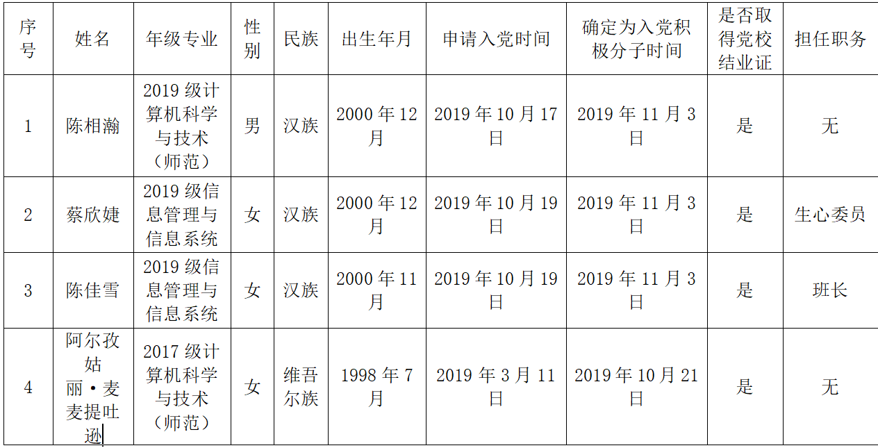 公司党委计算机科学与技术(师范)一党支部关于确定陈相瀚等7名同志为发展对象的公示