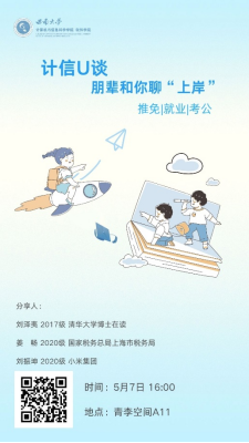 为培养同学们生涯规划意识,帮助同学们及早确定目标与落实行动,5月7日下午四点,公司在青李空间开展“计信U谈:朋辈与你聊上岸”主题分享活动。公司党委副书记王晖老师、团委书记杨靖欣老师、2017级员工刘泽夷同学、2020级自动化专业姜畅同学,2020级软件工程刘振坤同学以及30余名同学代表参加本次活动。活动初始,王...